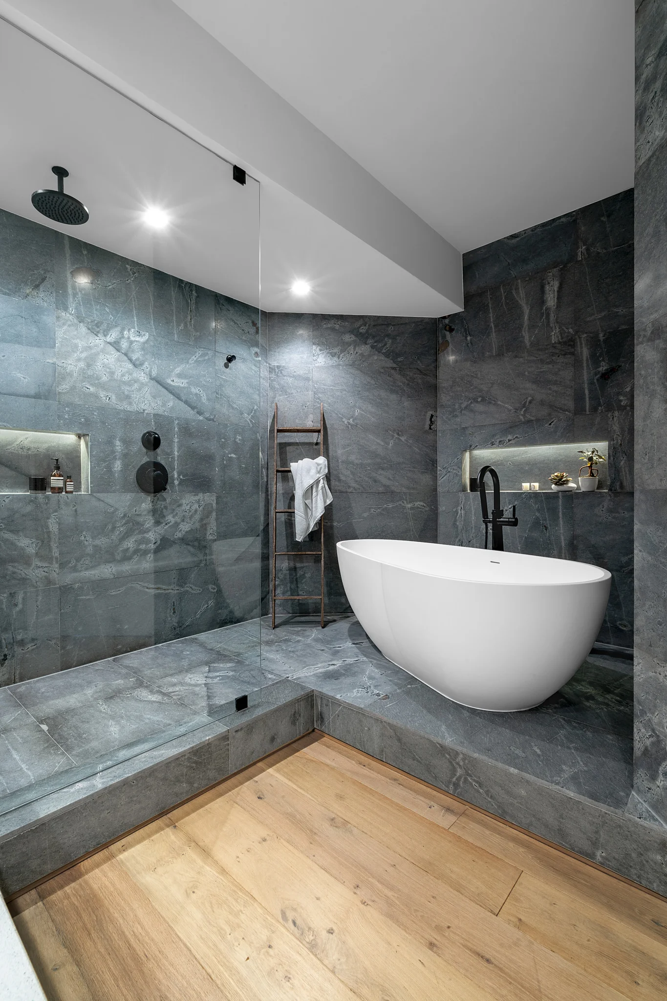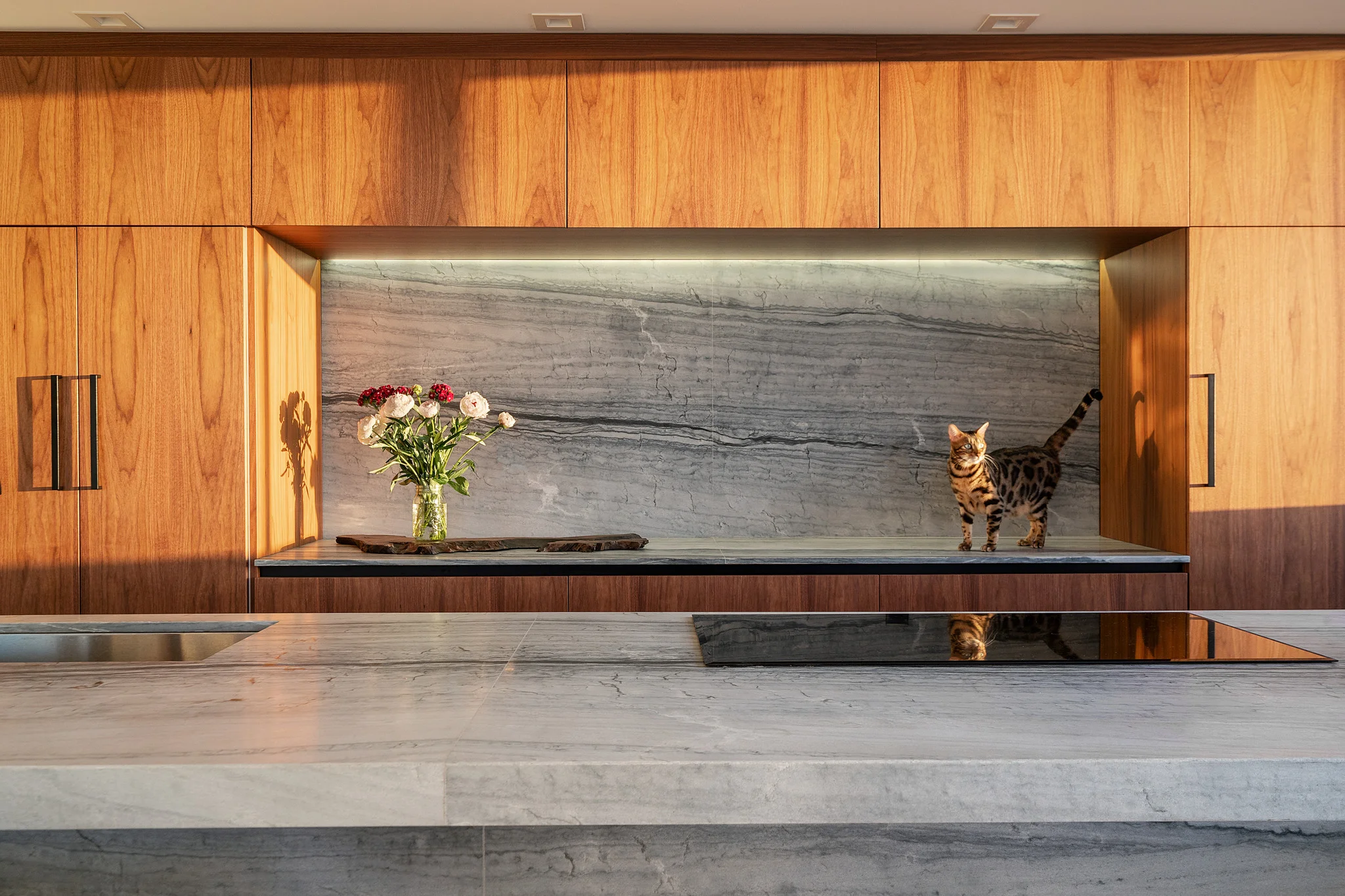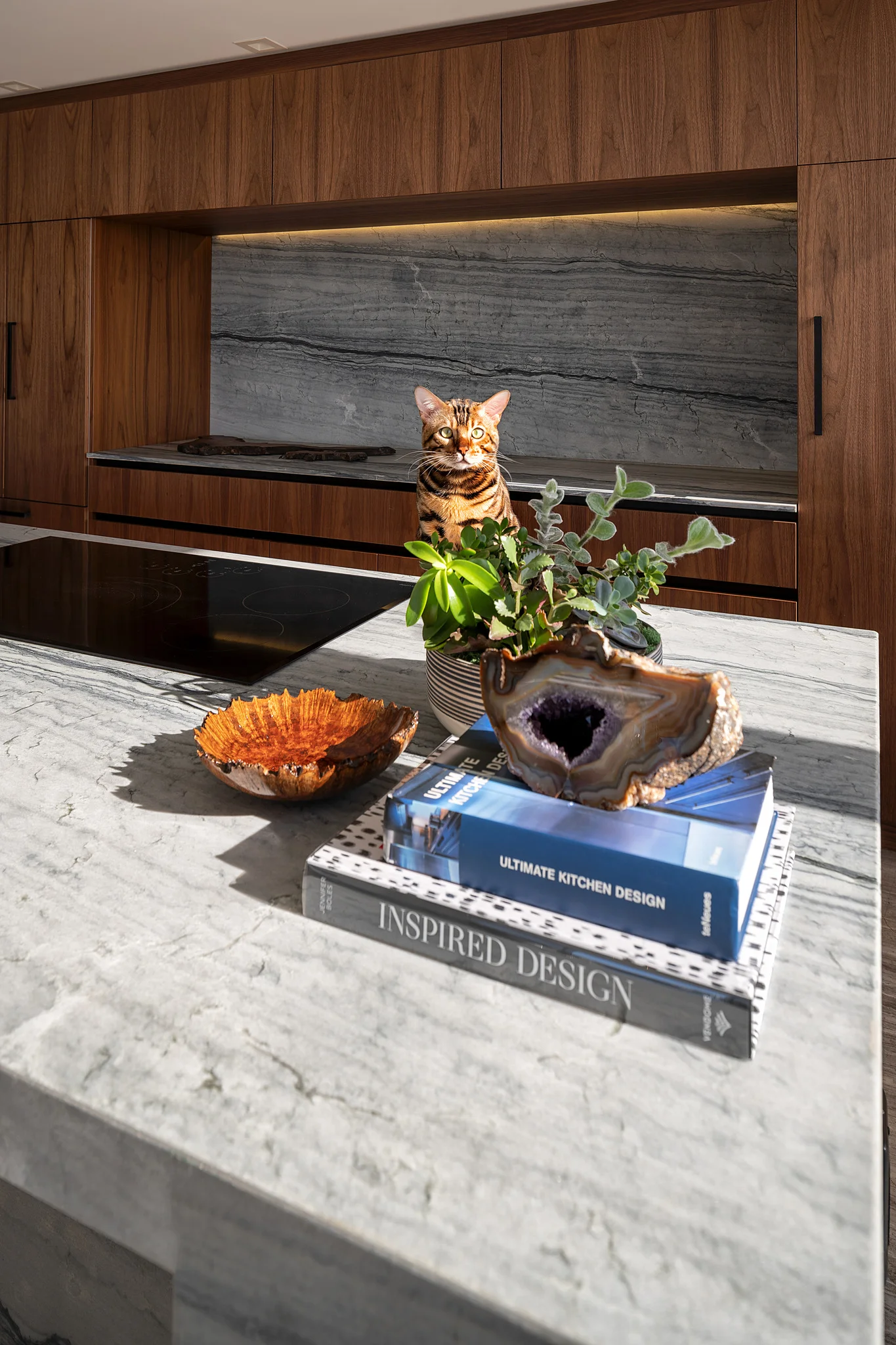 No expense was spared from the Italian marble floors and bathrooms to the genuine walnut kitchen. European Oak floors spread from the Master Bedroom into the Master Bath. A wall was opened to create an open living space with a marble waterfall island. Top-notch appliances, fixtures, and electric blinds for every window craft a rich experience. Sustainable redwood art, coffee tables, and decor provide an earthy touch to a minimalist experience.